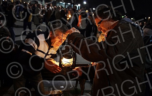 Svecani docek `Blagodatnog Ognja` iz Hrama Vaskresenja Hristovog u Jerusalimu ispred Hrama Svetog Save u Beogradu.