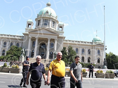 Okupljanje clanova i simpatizera Srpske radikalne Stranke ispred Skupstine Srbije u Beogradu. Povodom najave nevladinih organizacija da ce obeleziti godisnjicu u zlocina u Srebrenici.