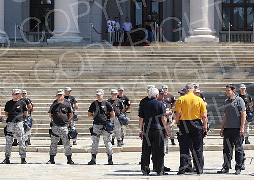 Okupljanje clanova i simpatizera Srpske radikalne Stranke ispred Skupstine Srbije u Beogradu. Povodom najave nevladinih organizacija da ce obeleziti godisnjicu u zlocina u Srebrenici.