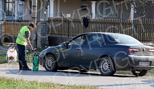 Organized by the local government volunteers carry out disinfection of all vehicles entering the territory of Smederevska Palanka.