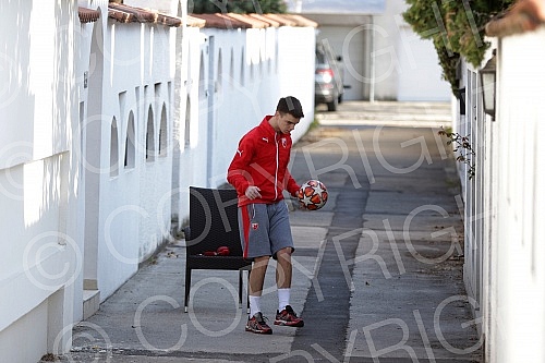 Former Red Star footballer, currently part of the team of Danish second baseman Andrija Rajovic, son of singer Boban Rajovic, practices with the ball outside the house.