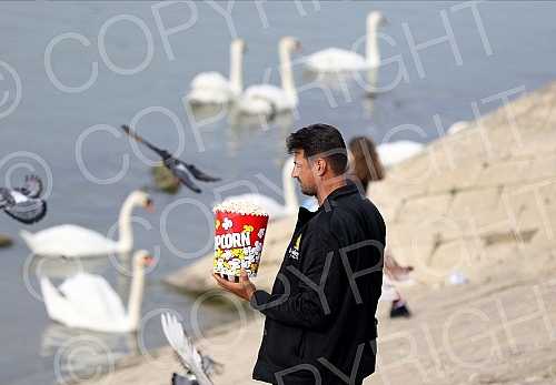 Bivsi odbojkas Vanja Grbic sa porodicom hrani labudove na setalistu 25 maj na Dunavu.