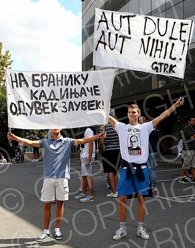 Protest navijaca Kosarkaskog kluba Partizan ispred stadiona FK Partizan u znak podrske treneru Dusku Vujosevicu.