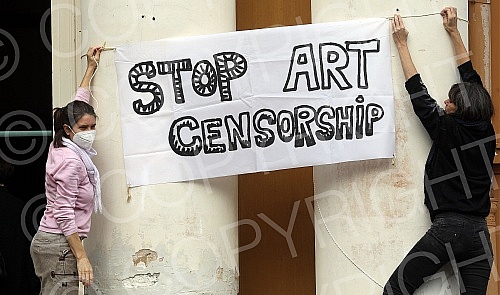 In front of the Cvijeta Zuzoric pavilion, a rally in support of the Momci art group and the Stara kapetanija gallery was held, organized by the Association of Fine Artists of Serbia.