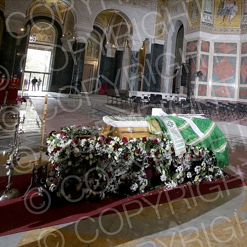 U Hramu Svetog Save na postament od cveca polozen je kovceg sa zemnim ostacima patrijarha Irineja.