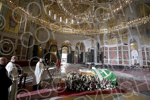 In the Temple of Saint Sava, a coffin with the remains of Patriarch Irinej was placed on a pedestal of flowers. U Hramu Svetog Save na postament od cveca polozen je kovceg sa zemnim ostacima patrijarha Irineja.
