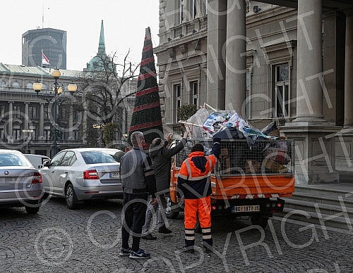A Christmas tree decorated in front of the City assembly by activists of the One in five million movement, the let's defend Kosutnjak initiative, the New party and the Green party in the action "Decorating the Christmas tree with garbage" was removed