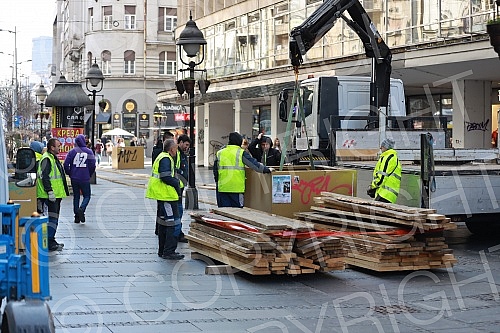 Dismantling of New Year's lighting elements in Knez Mihailova street. Demontaza elemenata novogodisnje rasvete u Knez Mihailovoj ulici.