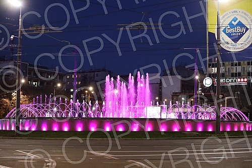 Roundabout on Slavija Square with illuminated fountain at night. Kruzni tok na Trgu Slavija sa osvetljenom fontanom nocu.