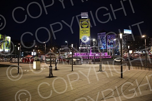 Roundabout on Slavija Square with illuminated fountain at night. Kruzni tok na Trgu Slavija sa osvetljenom fontanom nocu.