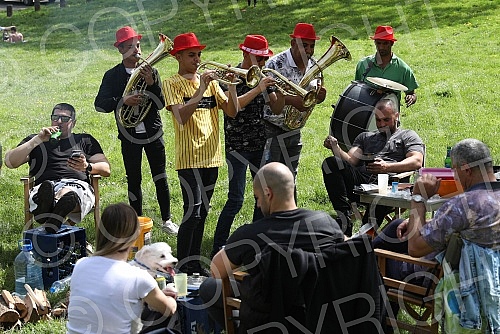Gradjani proslavljaju 1. maj, medjunarodni dana rada, na Kostunajku, a tu su i trubaci.