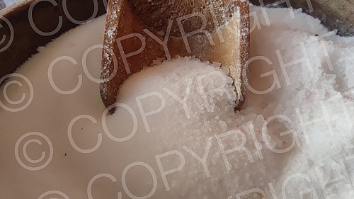 Wooden bowl with salt and spoon in it. So i kasika u drvenoj ciniji.