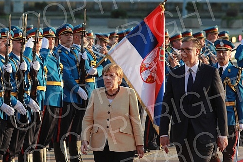 Festive reception of German Chancellor Angela Merkel in front of the Palace of Serbia. Svecani docek nemacke kancelarke Angela Merkel ispred Palate Srbija.