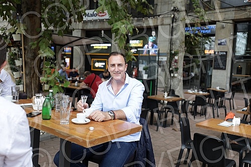 Singer Sergej Cetkovic with friends at coffee in Soljica Specialty Coffee and Drink Bar on Nikola Pasic Square. Pevac Sergej Cetkovic sa prijateljima na kafi u Soljica Specialty Coffee and Drink Bar na Trgu Nikole Pasica.
