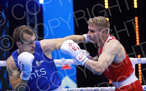 2021 Olympic Boxing World Championships - Stark Arena. Round 32, Light Heavyweight (80kg), Kaan Aykutsun(Turkey) (RED) vs Vladimir Mironchikov (Serbia).