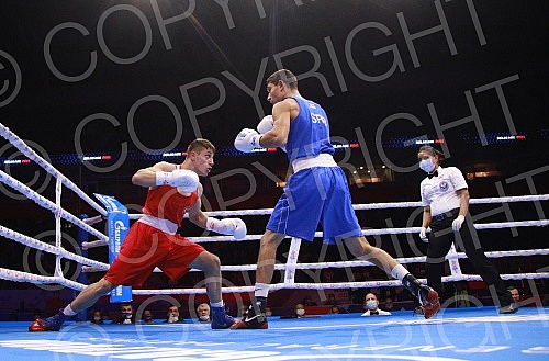 2021 Olympic Boxing World Championships - Stark Arena. Round 32, Light Welterweight (63.5kg), Kerem Oezmen (Turkey) (RED) vs Pavel Fedorov (Serbia).