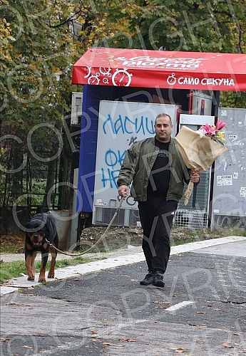 President of the Serbian right Misa Vacic on a walk with his pet Rottweiler Atila.