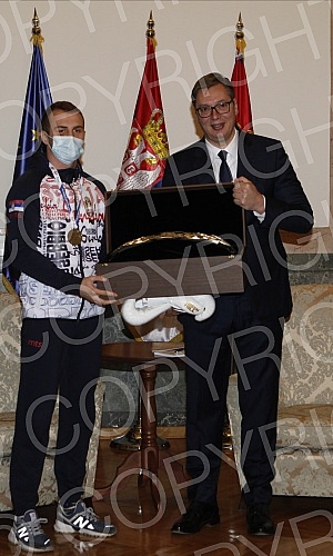 The President of the Republic of Serbia, Aleksandar Vucic, met with the winner of the bronze medal at the World Boxing Championship, Vladimir Mironcikov, and the delegation of the Boxing Association of Serbia.