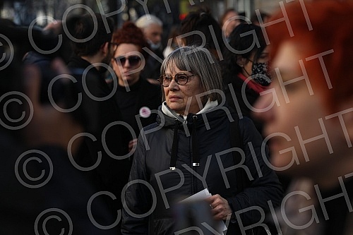 Natasa Kandic and Women in Black pasted graffiti dedicated to Ratko Mladic on the building of the Youth Center. Natasa Kandic i Zene u crnom prelepile su grafit posvecen Ratku Mladicu na zgradi Doma omladine.