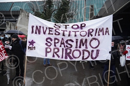 Gathering of citizens in front of the Sava Center who will join the protest and the blockade of the highway near the Sava Center with a request to ban the work of Rio Tinto in Serbia. Okupljanje gradjana ispred Sava centa koji ce se pridruziti prot