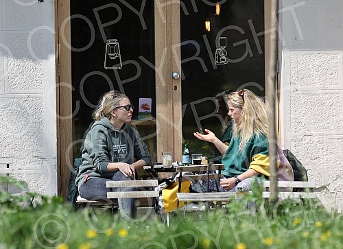 Rediteljka Jana Maricic i glumica Hristina Popovic uzivaju u subotnjem danu uz kafu u kaficu u centru grada.