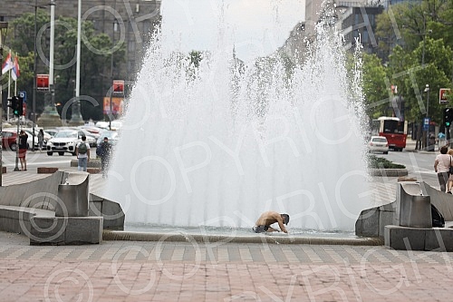 A migrant from Kuwait is bathing in a fountain on Nikola Pasic Square. Migrant iz Kuvajta se kupa u fontani na Trgu Nikole Pasica.