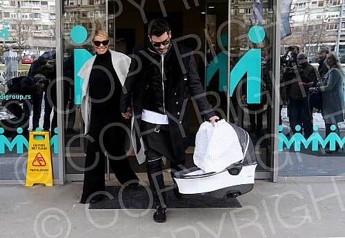 Serbian singer Natasa Bekvalac emerged from the maternity ward with daughter Katja and her husband Luka Lazukic.