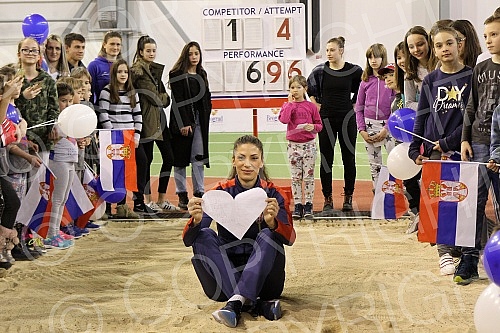 Ivana Spanovic, the winner of the gold medal at the WC indoor in the Birmingham. Docek Ivane Spanovic po osvajanju zlatn medalje na SP u dvorani u Birmigemu.