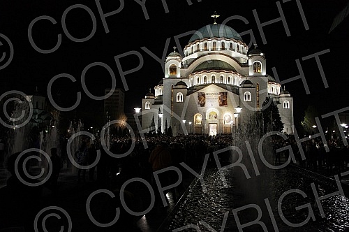 Svecani docek `Blagodatnog Ognja` iz Hrama Vaskresenja Hristovog u Jerusalimu ispred Hrama Svetog Save u Beogradu.