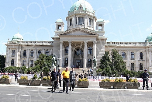 Okupljanje clanova i simpatizera Srpske radikalne Stranke ispred Skupstine Srbije u Beogradu. Povodom najave nevladinih organizacija da ce obeleziti godisnjicu u zlocina u Srebrenici.