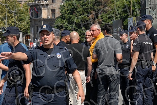 Okupljanje clanova i simpatizera Srpske radikalne Stranke ispred Skupstine Srbije u Beogradu. Povodom najave nevladinih organizacija da ce obeleziti godisnjicu u zlocina u Srebrenici.