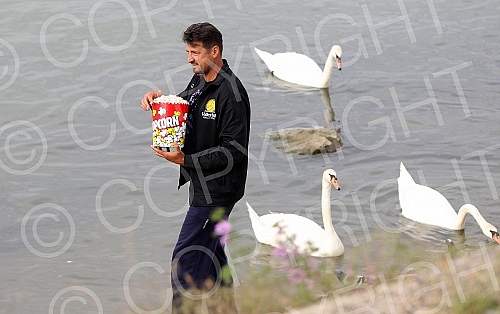 Bivsi odbojkas Vanja Grbic sa porodicom hrani labudove na setalistu 25 maj na Dunavu.