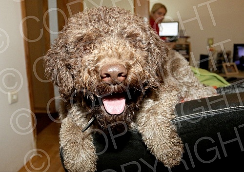 Cute lagotto romagnolo dog at home is lying on the couch. Lagotto romagnolo u stanu lezi na kaucu