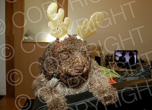 Cute lagotto romagnolo dog with reindeer ears. Lagotto romagnolo sa usima irvasa.
