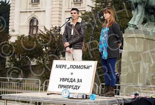 The Association of the Protector of entrepreneurs and businessmen organized a protest "Minutes to 12" in front of the Serbian parliament, with a demand to write off taxes and contributions on salaries of employees who were postponed due to the pandem