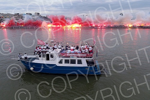 Spectacular celebration of the 32nd title of Serbian champion, fans and football players of FC Red Star from a bird's eye view.