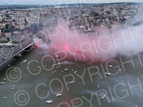 Spectacular celebration of the 32nd title of Serbian champion, fans and football players of FC Red Star from a bird's eye view.