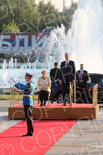 Festive reception of German Chancellor Angela Merkel in front of the Palace of Serbia.