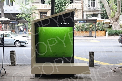 In front of the Municipality of Stari grad, the presentation of the photo-bioreactor "Liquid 3" for air purification and reduction of carbon dioxide emissions, known as "liquid wood". Ispred Opstine Stari grad predstavljanje foto-bioreaktora "Liquid