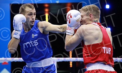 2021 Olympic Boxing World Championships - Stark Arena. Round 32, Light Heavyweight (80kg), Kaan Aykutsun(Turkey) (RED) vs Vladimir Mironchikov (Serbia).