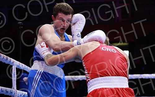 2021 Olympic Boxing World Championships - Stark Arena. Round 32, Light Heavyweight (80kg), Luka Plantic (Croatia) (RED) vs Aliaksei Alfiorau (Belarus).