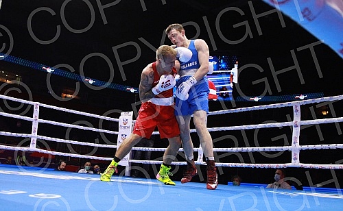 2021 Olympic Boxing World Championships - Stark Arena. Round 32, Light Heavyweight (80kg), Luka Plantic (Croatia) (RED) vs Aliaksei Alfiorau (Belarus).