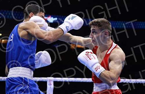 2021 Olympic Boxing World Championships - Stark Arena. Round 32, Light Welterweight (63.5kg), Kerem Oezmen (Turkey) (RED) vs Pavel Fedorov (Serbia).