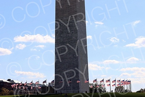 The Washington Monument, a monument to George Washington, the first President of the United States, is one of the most prominent landmarks in Washington and stands as a central part of the National Mall, and is surrounded by American flags. Vasingt