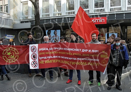 The New Communist Party of Yugoslavia held a rally in support of the Donetsk and Luhansk People's Republics, which have been under aggression by the Kiev fascist junta in Knez Mihailova Street for eight years.
