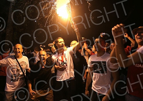 Squad of KK Crvena zvezda celebrate trophy at Kalemegdan.
