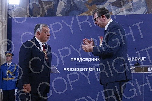The President of Serbia, Aleksandar Vucich, presented the Prime Minister of Hungary, Viktor Orban, with the Order of the Republic of Serbia on a large necklace for outstanding services in developing and consolidating peaceful cooperation and friendly