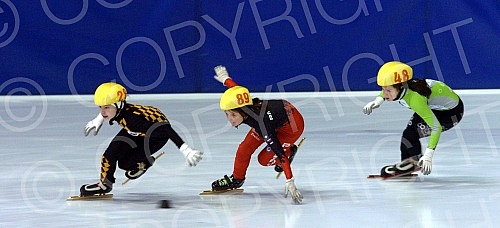 Serbian Championships in speed skating held in Pionir Ice Hall - Detail from speed skating race at the younger categories Open Championship of Serbia in the discipline short path - Short track.