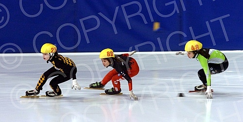 Serbian Championships in speed skating held in Pionir Ice Hall - Detail from speed skating race at the younger categories Open Championship of Serbia in the discipline short path - Short track.