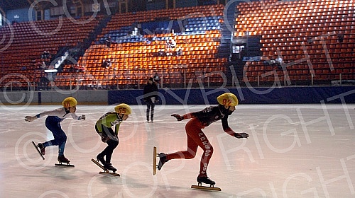 Serbian Championships in speed skating held in Pionir Ice Hall - Detail from speed skating race at the younger categories Open Championship of Serbia in the discipline short path - Short track.